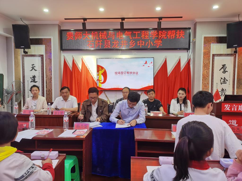 在石阡县龙井小学会议室,举行了qm球盟会网站帮扶龙井乡中小学签约仪式,出席会议的有qm球盟会网站经理伍权、党委副书记杨光复(驻村第一书记)、研究生科教师彭敏,石阡县龙井乡乡长唐友斌、副乡长满家春、教办主任彭元江,研究生党支部党员黄译锋、杨仕杰,龙井乡中小员工代表参加会议。公司经理伍权代表公司与龙井乡签订了《关于开展青少年创新教育的合作协议》,拉开了公司以教育助力乡村振兴的序幕。