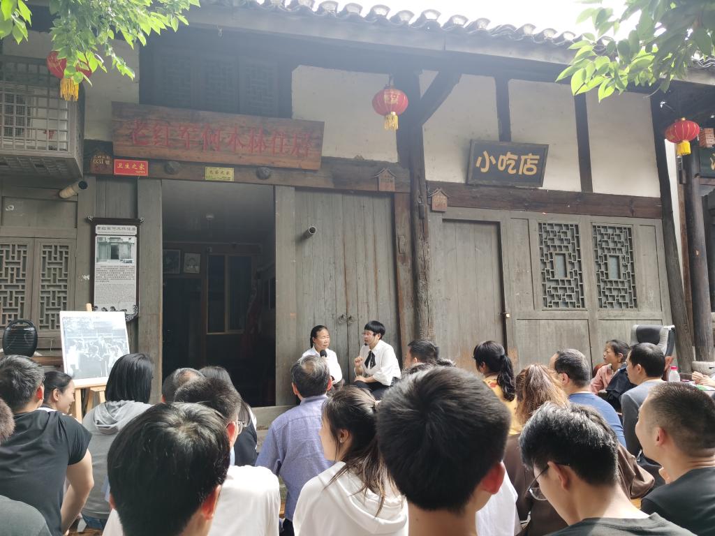 在老红军何木林住居门前,四渡赤水培训基地的教师和何木林的儿媳林成英老人共同为大家讲述了《永远的老红军——何木林》。何木林是赣南籍红军,在青杠坡战斗中负伤之后,被当地的百姓救起,留在了土城,由于他的口音和当地人不一样,为了不暴露自己的身份,更为了不连累救他的村民,他就装成一个聋哑人在土城生活,一装就是14年,直到新中国成立后,何木林被追认为红军,但从没有向国家和组织提过任何要求,并用言传身教深深影响着他的后人。他将自己的儿子何世州送至当时贵州条件最苦最累的息烽南山煤矿去挖煤,他的儿媳在纺织厂干着跟男工一样的工作,他的大外孙女成为了四渡赤水纪念馆的一名解说员。他们始终牢记自己是红军的后代,在各自的岗位上用行动传承红色记忆,弘扬优良家风。