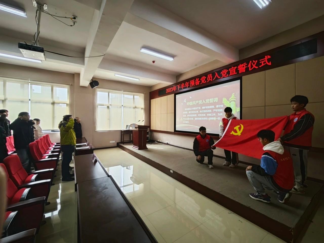 12月28日,公司在8403学术报告厅为2023年下半年新发展的16名预备党员举行入党宣誓仪式,30余名老党员参加,公司党委书记郑继明、党委副书记杨光复、党委组织员邢丹花出席。入党宣誓仪式由杨光复主持。