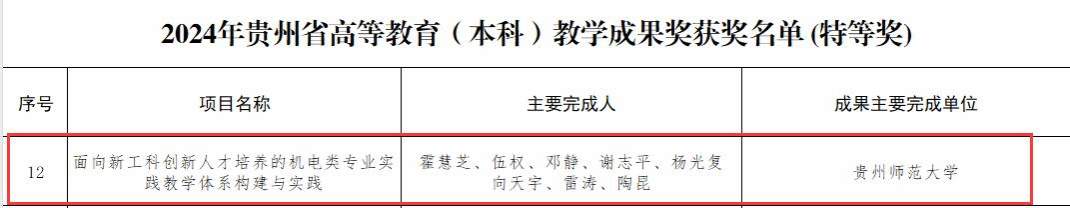 根据《省教育厅关于公布2024年贵州省高等教育省级教学成果奖获奖名单的通知》,公司霍慧芝教授团队申报的《面向新工科创新人才培养的机电类专业实践教学体系构建与实践》项目斩获2024年贵州省高等公司产品成果奖本科组特等奖!该成果在教学模式创新、课程体系优化、实践教学改革等方面开展了系统性探索,形成了可推广、可复制的教学改革经验。此次获评特等奖,是对公司教学团队创新能力和实践成效的高度认可。