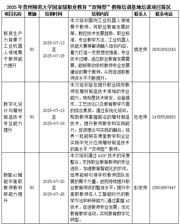 为深入贯彻全国教育大会精神,落实《教育强国建设规划纲要(2024-2035年)》要求,助力构建完善的教师专业发展支持服务体系,加强新时代高水平职业教育教师队伍建设,依据教育部教师工作司《关于组织参加国家级职业教育培训基地2025年培训项目的通知》(教育部司局函件),qm球盟会网站将于2025年7月在贵州省贵阳市组织开展职业教育“双师型”教师培训共3期。现将各培训项目信息予以发布。