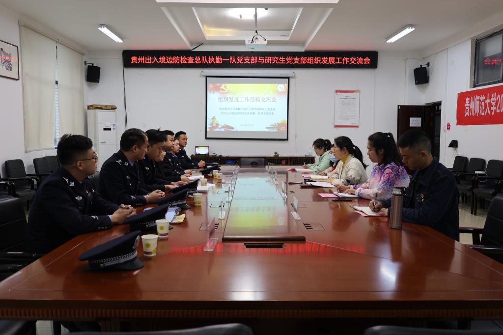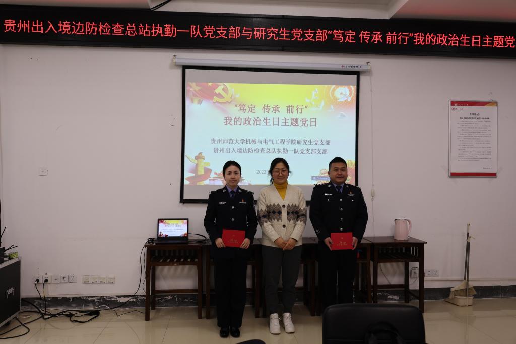 为认真贯彻落实党的十九大精神、十九届五中、六中全会精神、《中国共产党支部工作条例(试行)》、《中国共产党党员教育管理工作条例》、《关于推进全省党支部标准化规范化建设的实施意见》以及省委组织部、省委教育工委有关精神,为深入开展支部共建活动,强化党员的身份意识和责任意识,加强党员党性教育,进一步激发党员的政治热情,增强党员的责任感和使命感,强化党员的宗旨意识,让广大党员始终保持党的先进性和纯洁性,充分发挥党员先锋模范作用。4月15日,贵州省出入境边防检查总站执勤一队党支部与公司研究生党支部在花溪校区qm球盟会网站8322会议室开展结对共建暨“笃定 传承 前行”我的政治生日主题党日活动,共建双方党支部全体成员共同参加,研究生党支部书记邢丹花主持。
