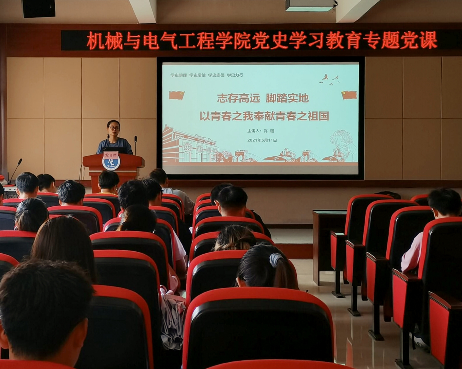 5月12日,辅导员许珊作为先进典型代表,在8403学术报告厅为2021年度党支部书记暨党团骨干培训班的学员上了题为“志存高远 脚踏实地 以青春之我奉献青春之祖国”的专题党课,她从五四运动讲到了一群年轻人建党的坚辛历程,宣讲了“五四精神”。