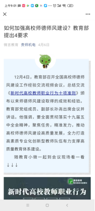 4月6日,公司启动了师德师风宣传教育活动月,通过微信公众号推送师德师风建设相关制度、案例,通过教职工政治理论学习开展师德师风专题教育。