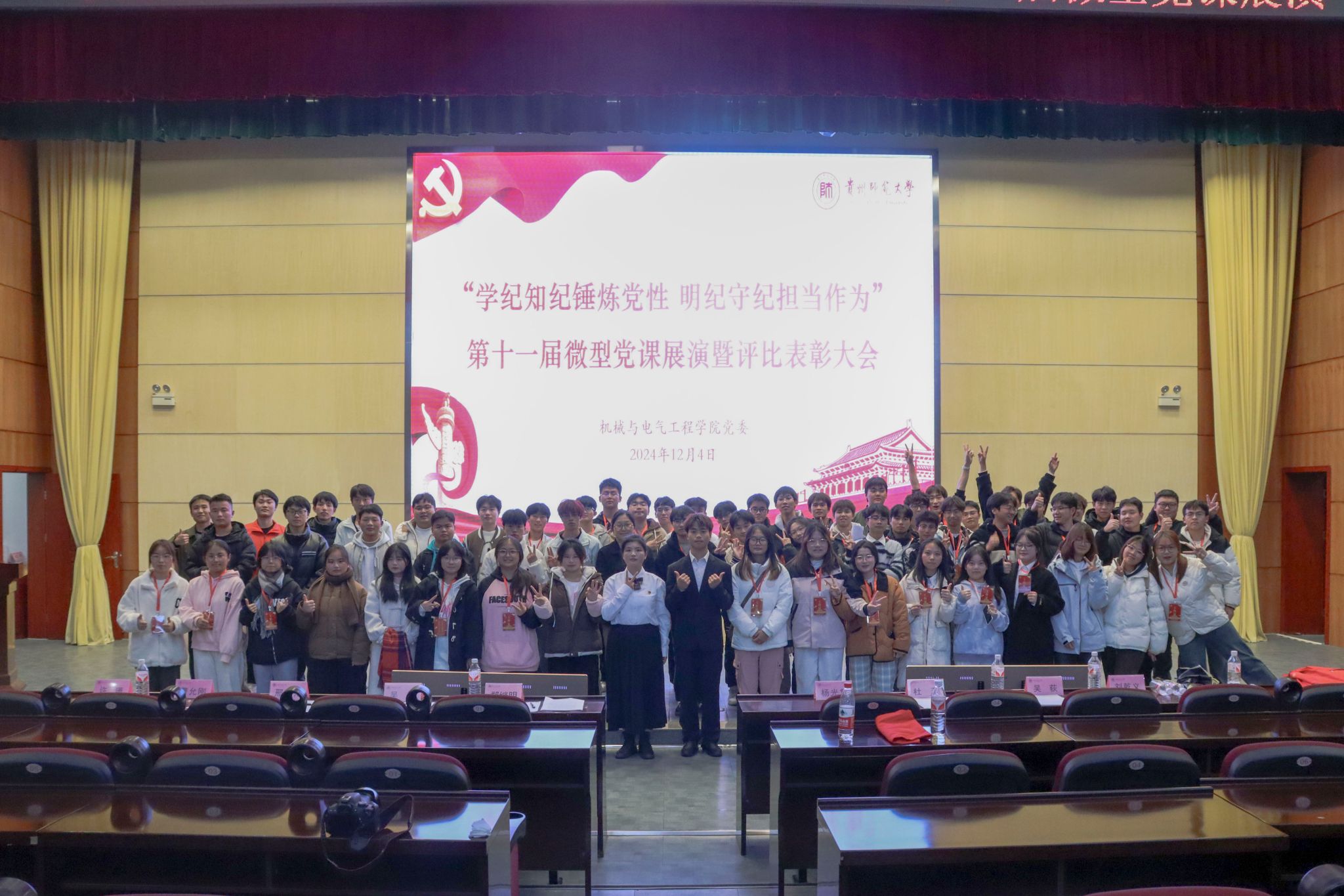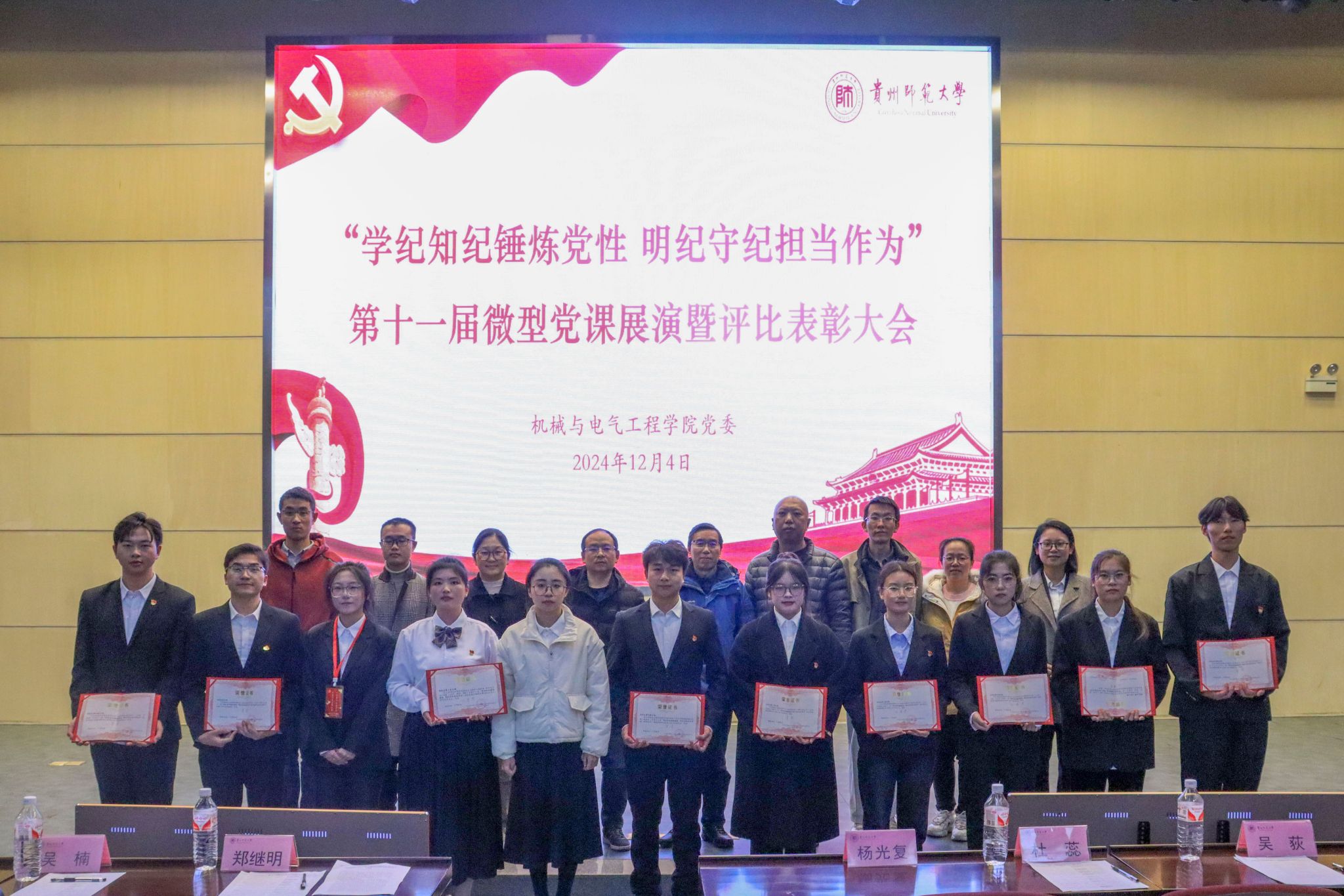 为进一步巩固深化党纪学习教育成果,坚持融入日常、抓在经常,把党纪学习教育成果持续转化为推动高质量发展的强大动力,善始善终抓好党纪学习教育任务落实,常态化推进学纪知纪明纪守纪。12月4日晚,公司在会议中心一楼学术报告厅隆重举办“学纪知纪锤炼党性,明纪守纪担当作为”第十一届主题微型党课汇报展演暨评比表彰大会。公司全体员工党员,团委、员工会、青年志愿者分会、宣传中心的员工干部代表以及各年级的入党积极分子代表参加。公司党委书记郑继明、党委副书记杨光复、党委委员吴楠、各师生党支部书记出席活动并担任评委。