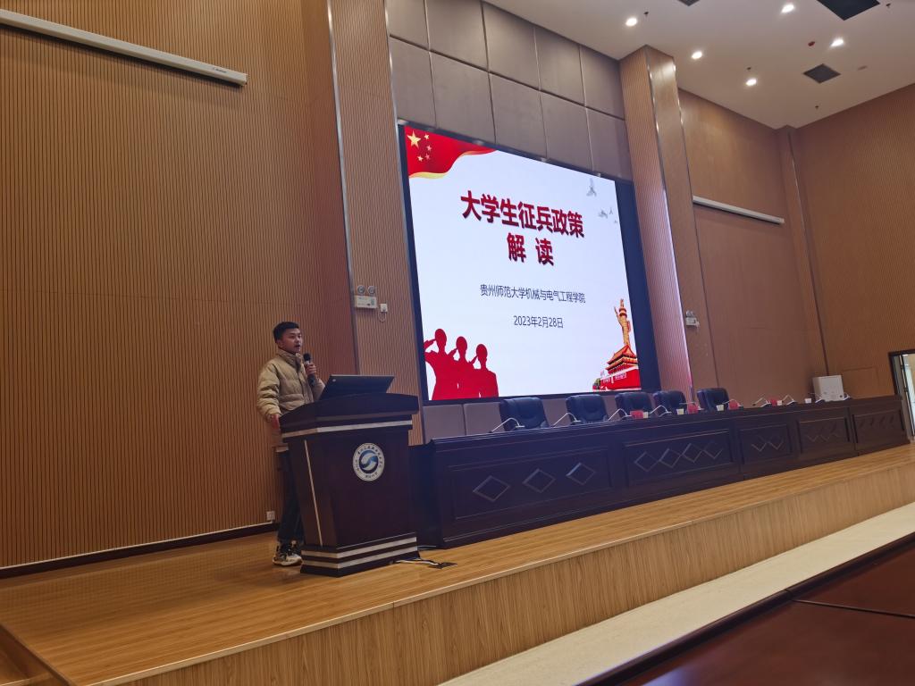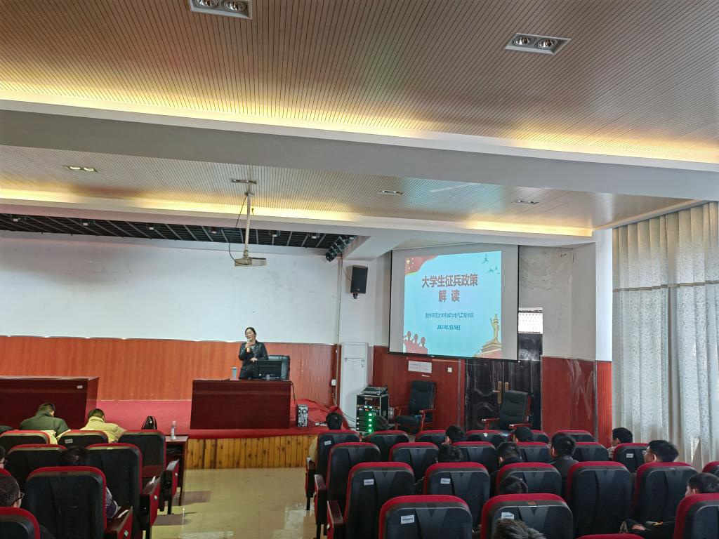 为积极适应大学毕业生为重点的征兵工作新特点、新要求,帮助公司在两所专升本联合培养公司就读的老员工更好地了解征兵政策,激发他们的应征热情,2月28日,公司党委副书记杨光复、征兵联络员邢丹花、退伍军人张林、蒋良广和陈叶双一行先后到贵州交通职业技术公司和贵州装备制造职业公司,为公司联合培养的400余名专升本员工宣讲了征兵政策。