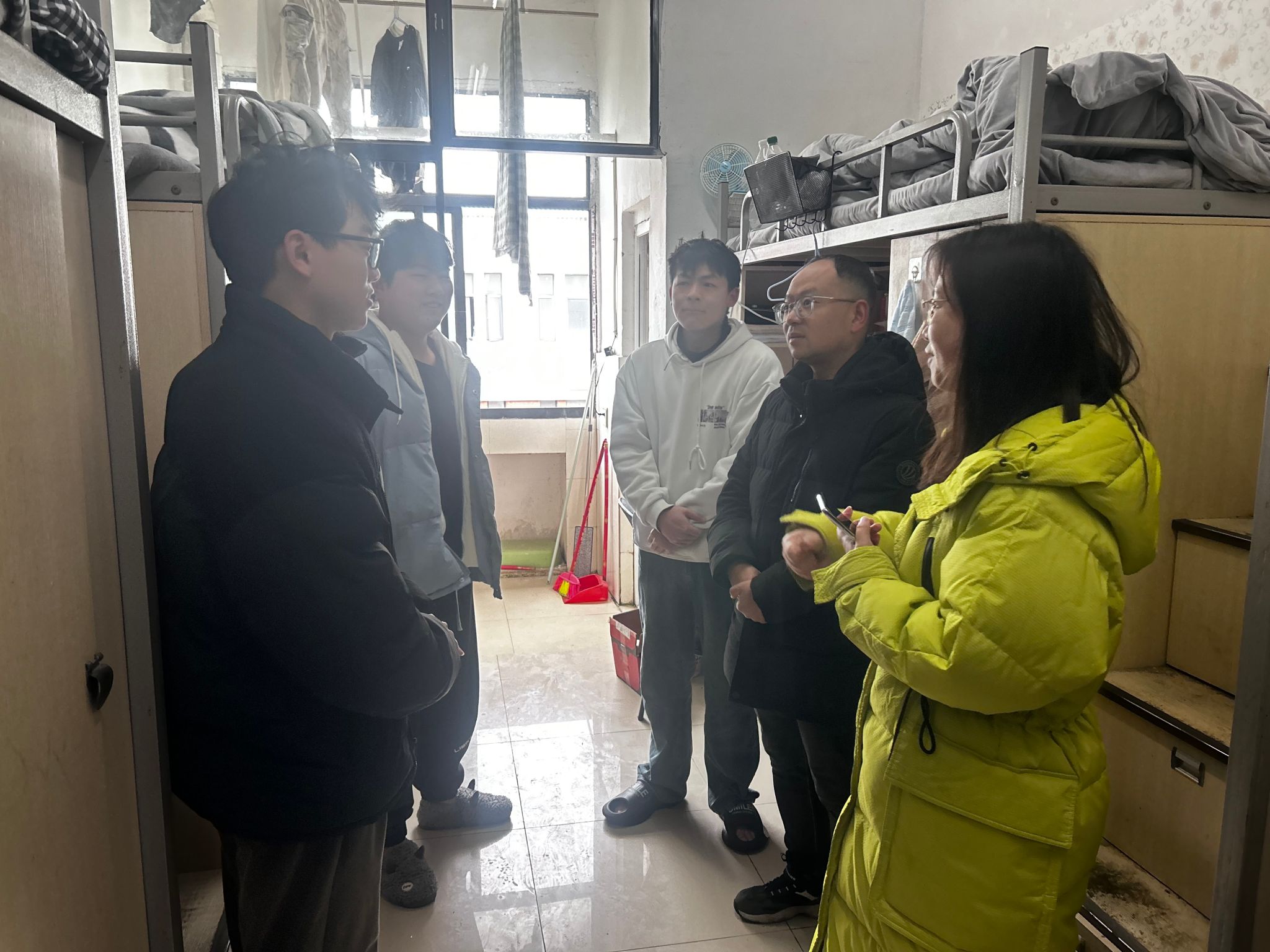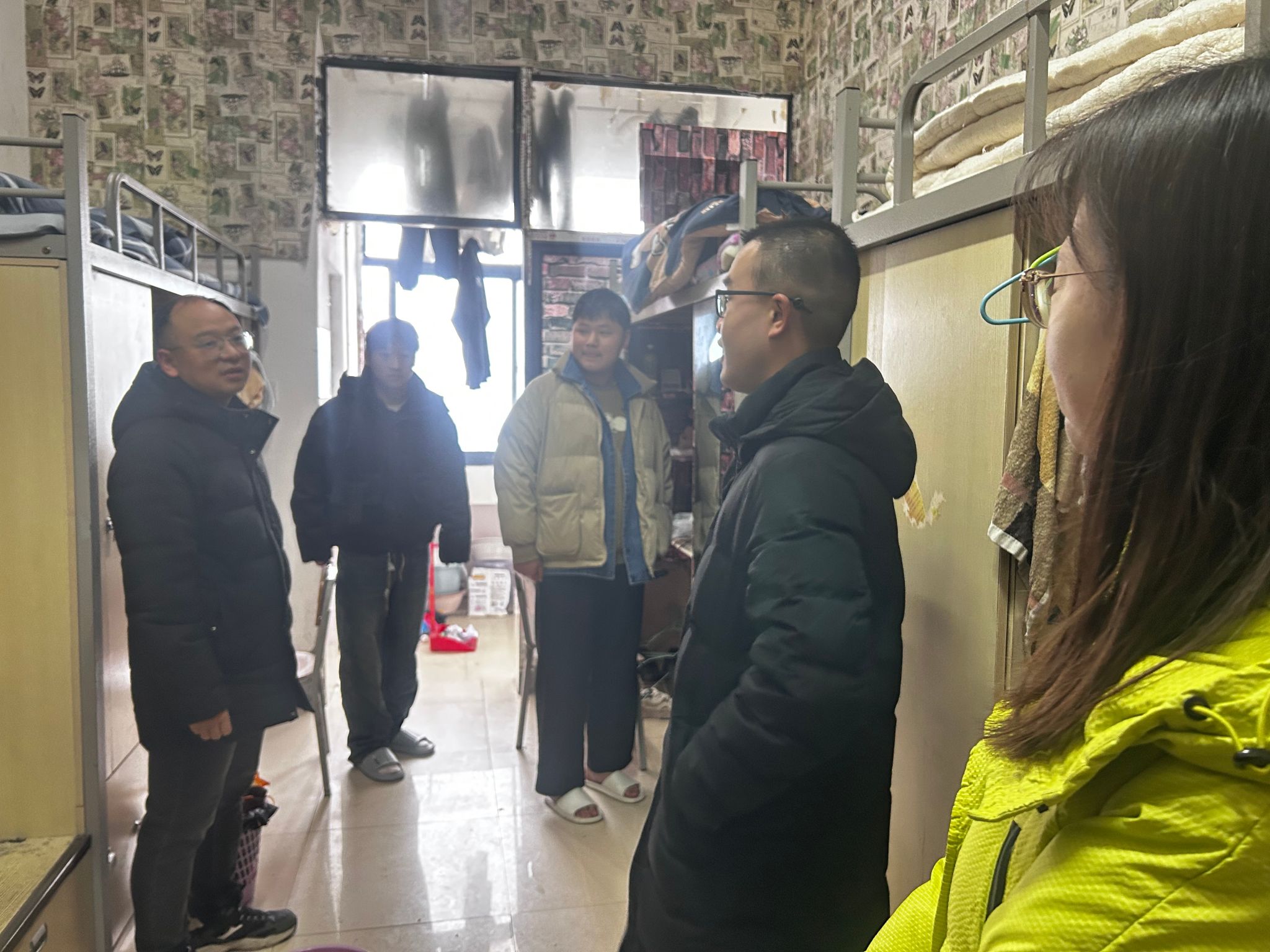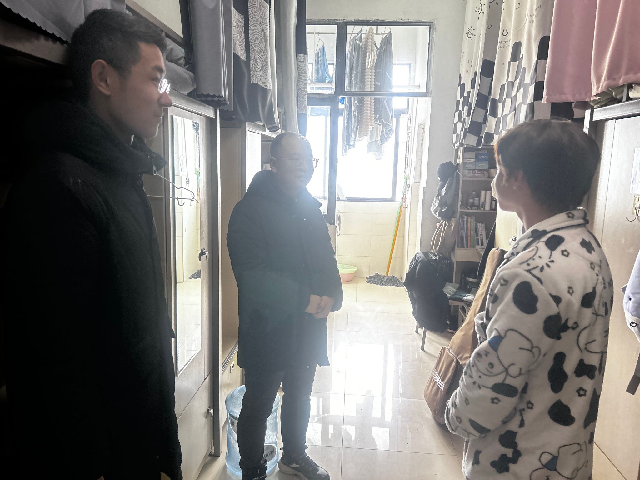 开学在即,为深入了解员工返校后的生活适应情况,确保新学期各项工作顺利开展,2月23日,机电公司党委副书记杨光复带领全体辅导员深入走访致新书院15栋员工宿舍,为同学们送去温暖关怀和新学期祝福。