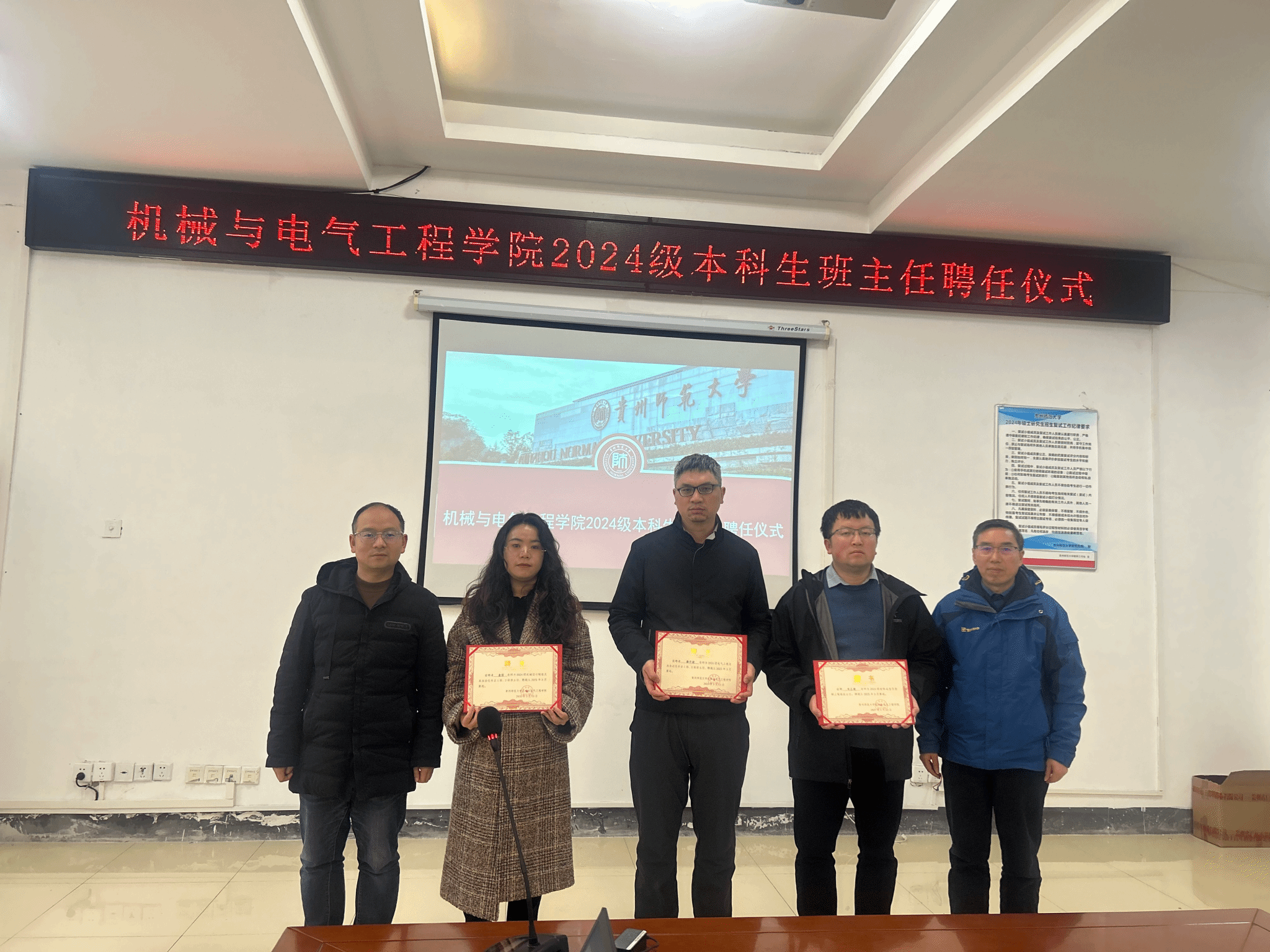 此外,会议还举行了2024级本科生班主任聘任仪式,韦正超、薛开昶、金洁等三名博士老师担任2024级本科生班主任。郑继明为新聘任的班主任颁发了聘书,并对他们提出了殷切期望,希望他们能够积极履行职责,关心关爱员工,帮助员工成长。