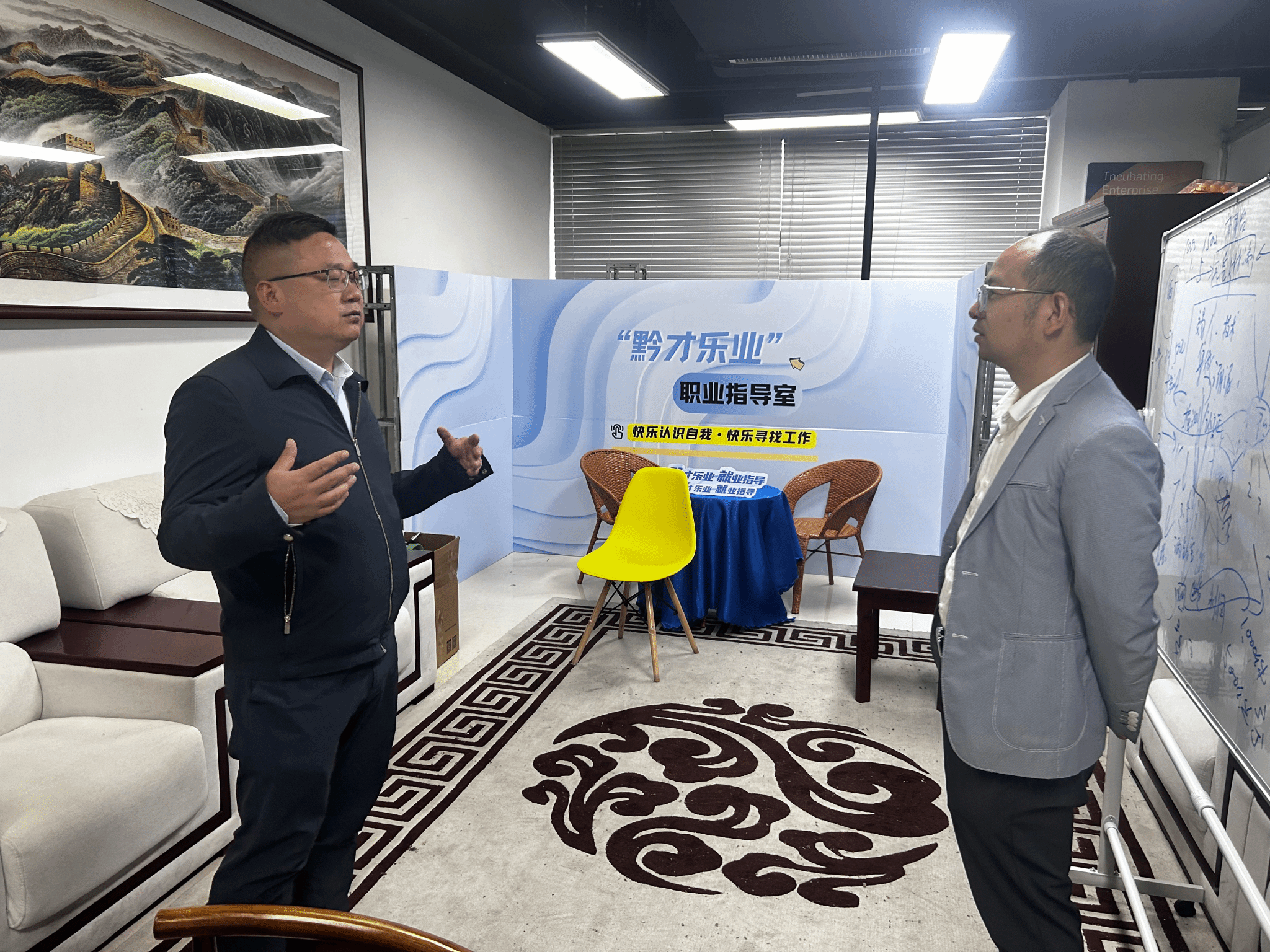 在杨文德的陪同下,杨光复一行参观了公司的 “黔才乐业”职业指导室,指导室拥有一支由资深人力资源专家组成的专业职业指导团队,他们不仅能为求职者提供一对一咨询辅导服务,还定期开展职业规划讲座,分享行业发展趋势等内容,助力求职者提升职业素养。