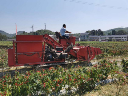 辣椒收获机采收朝天椒时田间试验表明,该设备对我省山地地形和辣椒品种具有良好的适应性,辣椒采净率、含杂率以及生产率等技术指标都优于同类产品。目前,设备已在遵义绥阳县、播州区等辣椒种植基地进行了示范推广,为我省乡村振兴、农业现代化贡献农机能量。