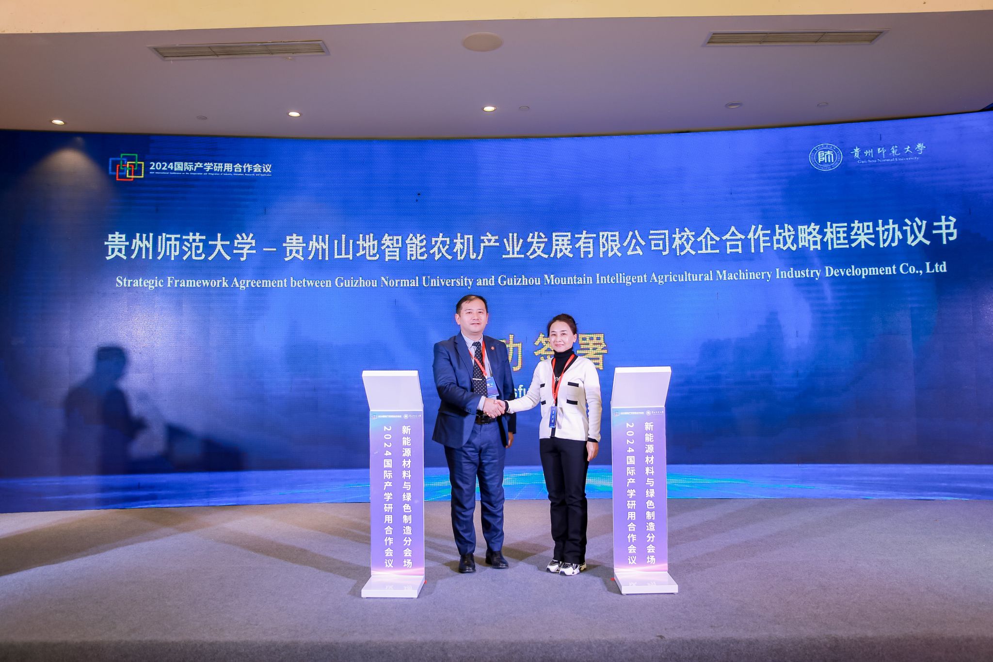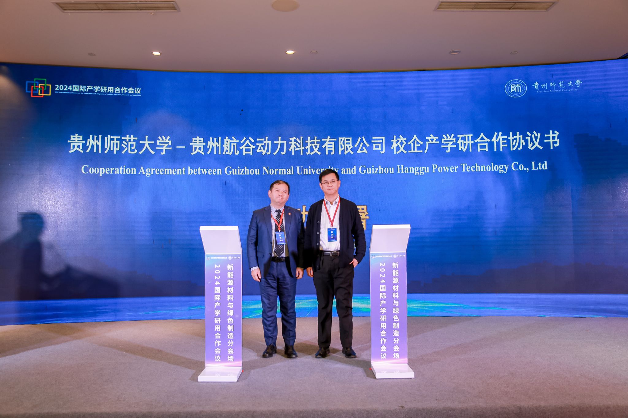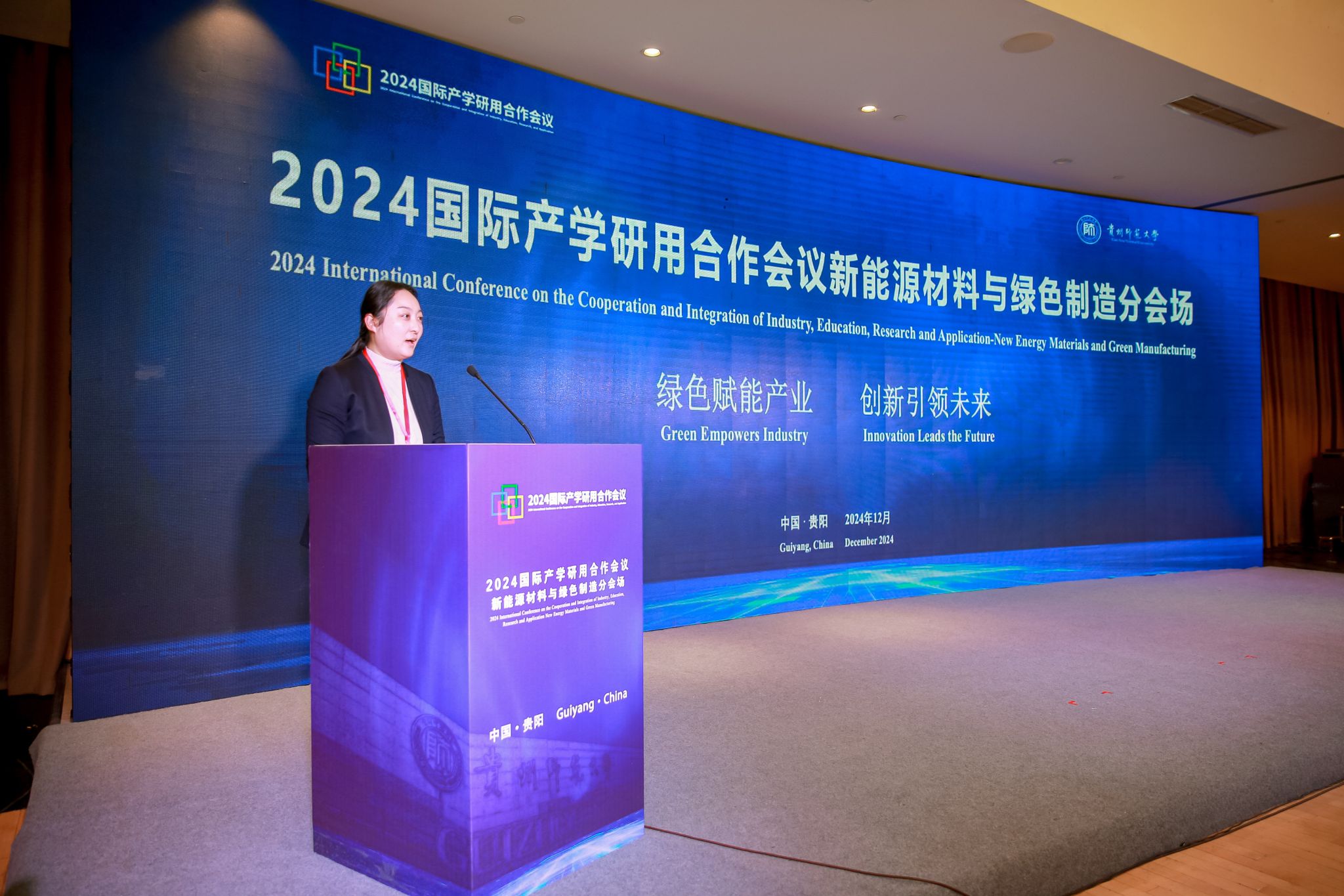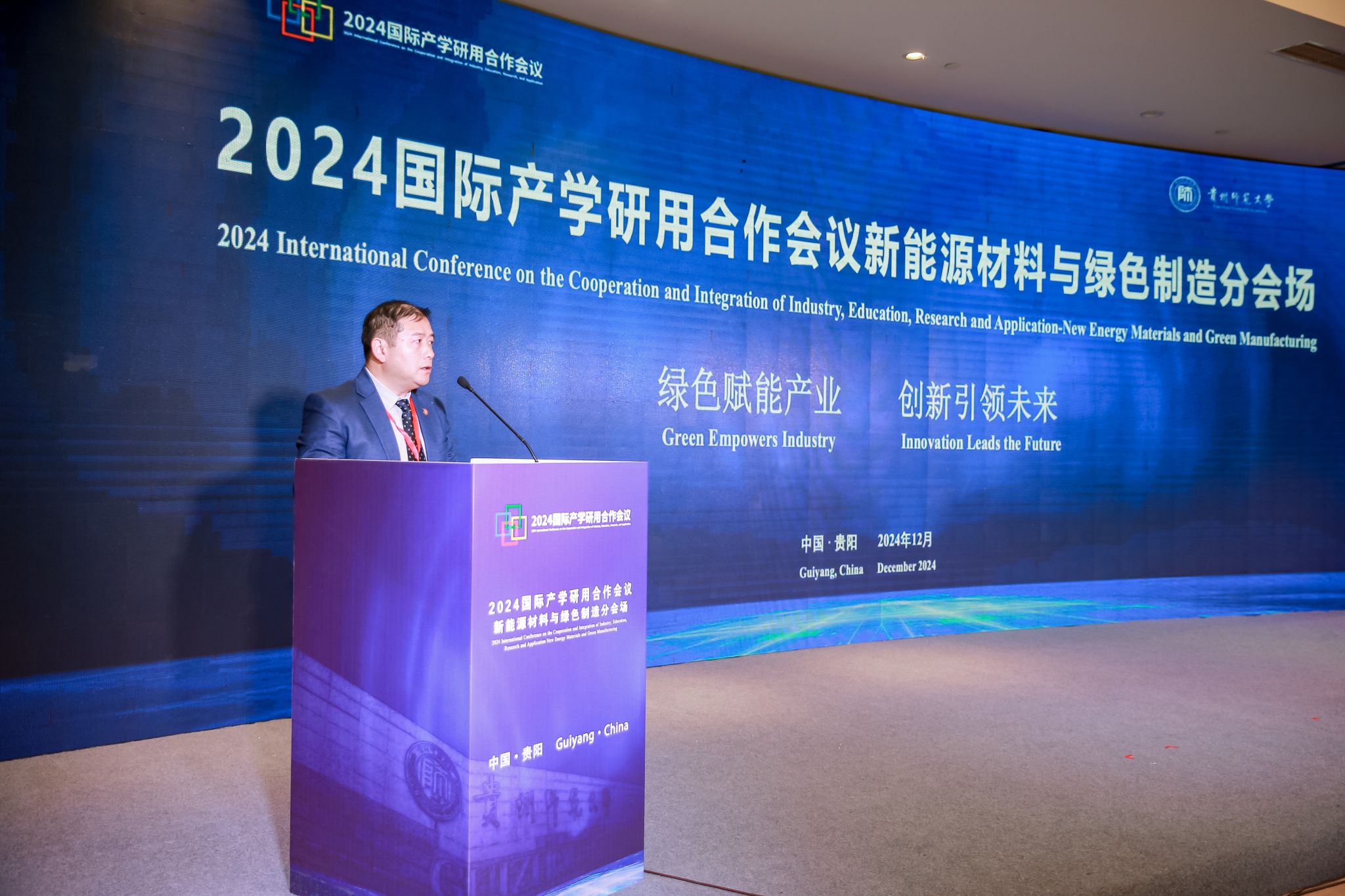 12月14日,绿色赋能产业 创新引领未来——2024国际产学研用合作会议新能源材料与绿色制造分会场会议在贵阳市花溪区大成精舍酒店会议厅举行。本次会议由贵州省教育厅主办,qm球盟会网站承办,遵义师范公司、贵州航谷动力科技有限公司、贵州兴富祥立健机械有限公司、贵州安大航空锻造有限责任公司、中伟新材料股份有限公司、贵州长通集团智造有限公司等单位协办。来自美国、英国、俄罗斯、加拿大、意大利、波兰、泰国等10余个国家和地区的高等院校、科研院所及行业企业共140名嘉宾参会。
